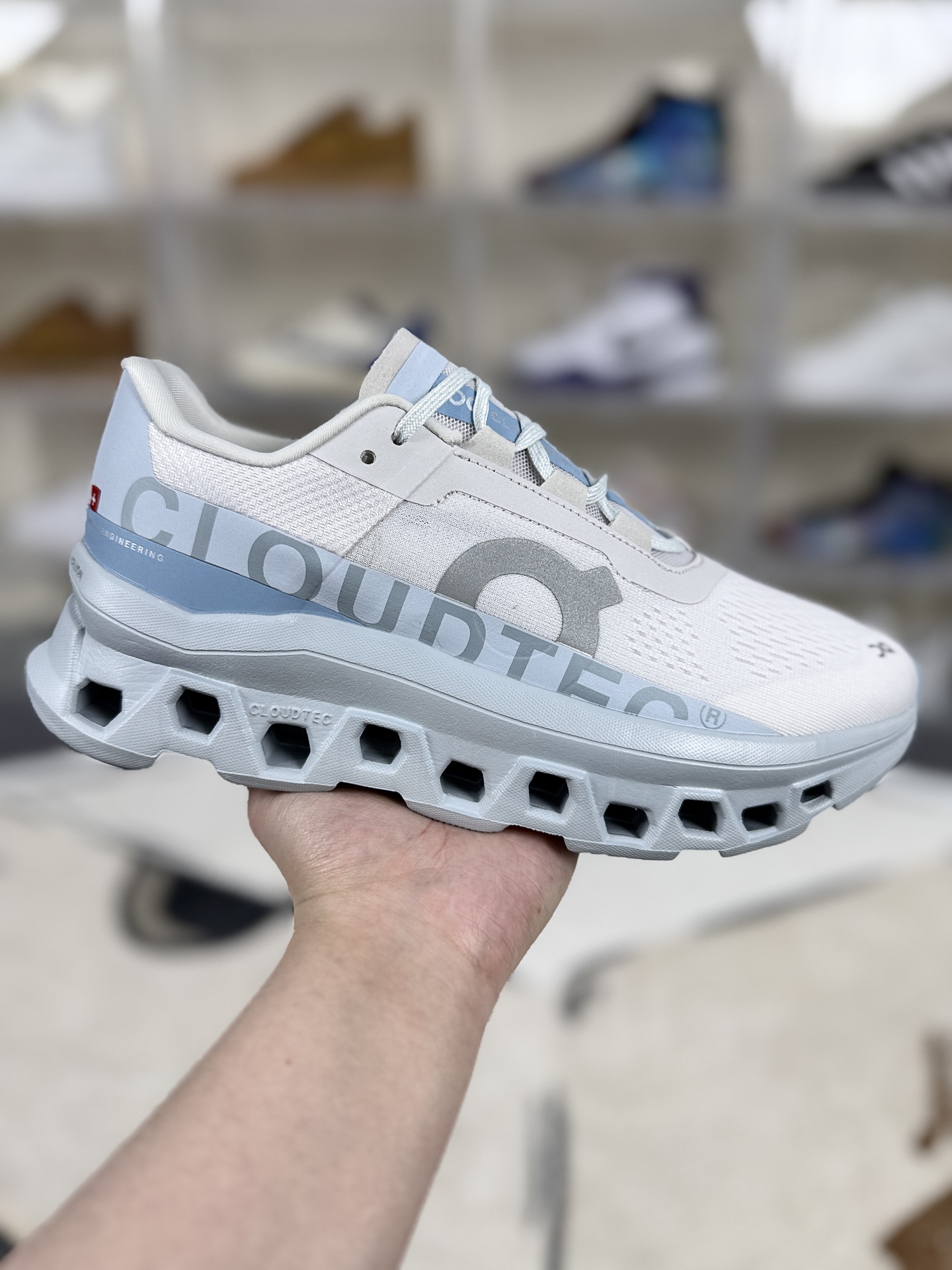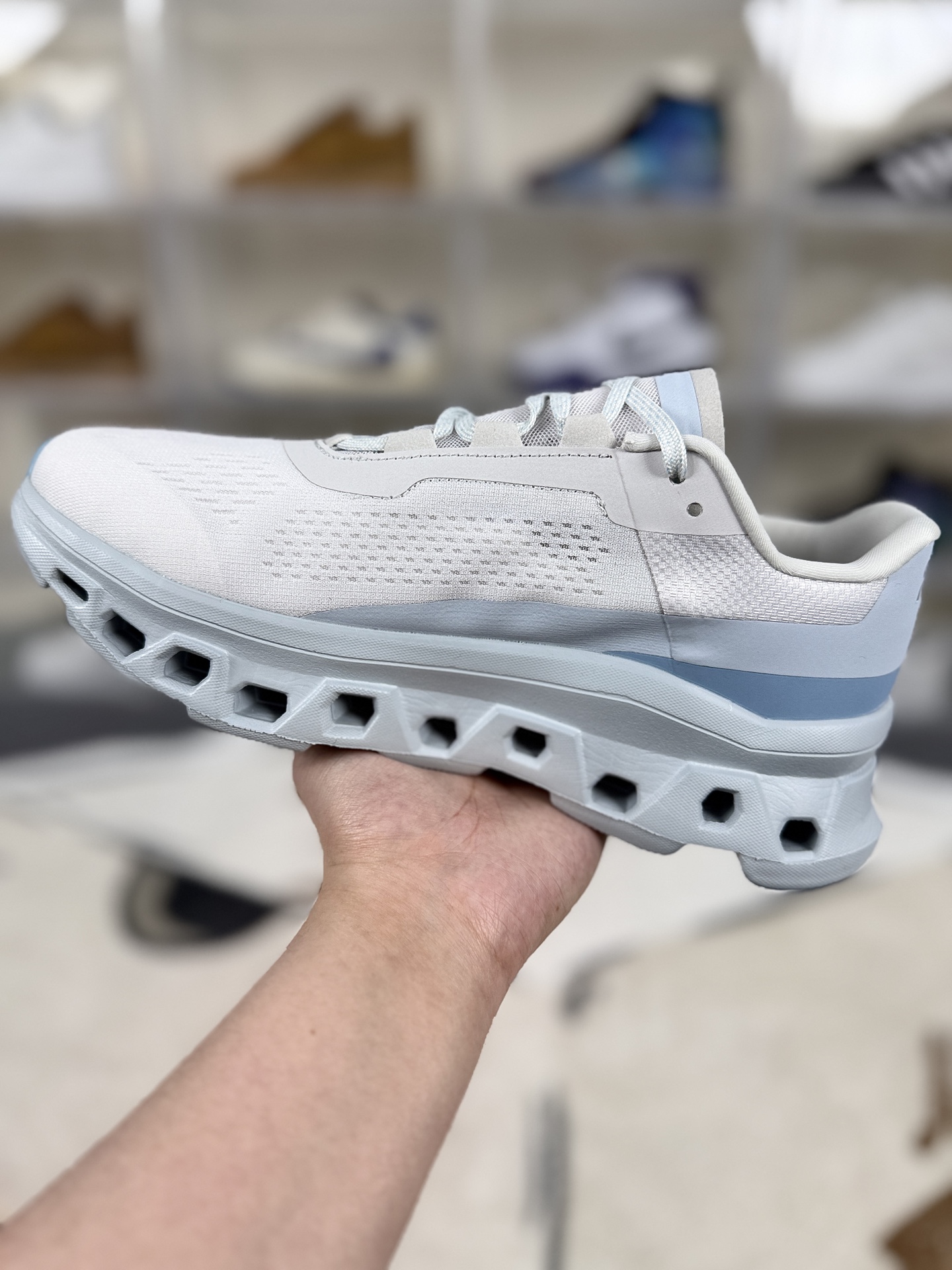 On昂跑 Cloudmonster 1 小怪兽1代 舒适百搭减震耐磨透气防滑 低帮 训练跑步鞋 男女款 白蓝 ▪️尺码:36-45(36 36.5 37 37.5 38 38.5 39 40 40.5 41 42 42.5 43 44 44.5 45) ▪️货号:61.97653 ▪️On昂跑Cloudmonster 1(小怪兽1代)是一款定位为长距离跑步的高性能跑鞋。延续昂跑标志性的“蜂巢底”设计,搭载迄今为止体积最大的Cloud模块,中底厚实且造型夸张,视觉上极具辨识度,被称为“怪兽鞋”。厚实的中底和Cloud模块提供出色的缓震效果,能有效吸收地面冲击力,保护关节;宽大的鞋底和稳定的结构设计,为脚部提供良好的支撑,适合全掌或前掌着地的跑者。Speedboard速度板与Helion泡棉的组合,使鞋子在缓震的同时具备强大的回弹性能,跑者能感受到明显的推进力,有助于提升跑步效率,尤其在中高速配速下表现突出。网面鞋面透气性良好,长时间跑步不易闷热;鞋楦略宽,中足和后跟锁定稳固,鞋舌和后跟采用柔软材质,减少摩擦,适合长时间穿着。主要适用于日常路跑、长距离训练及恢复跑,适合追求舒适脚感、注重缓震与回弹性能的跑者,尤其适合在塑胶跑道、柏油路等平坦路面跑步。其时尚的外观设计,也可作为日常通勤或休闲穿搭的选择,兼具功能性与时尚感。
